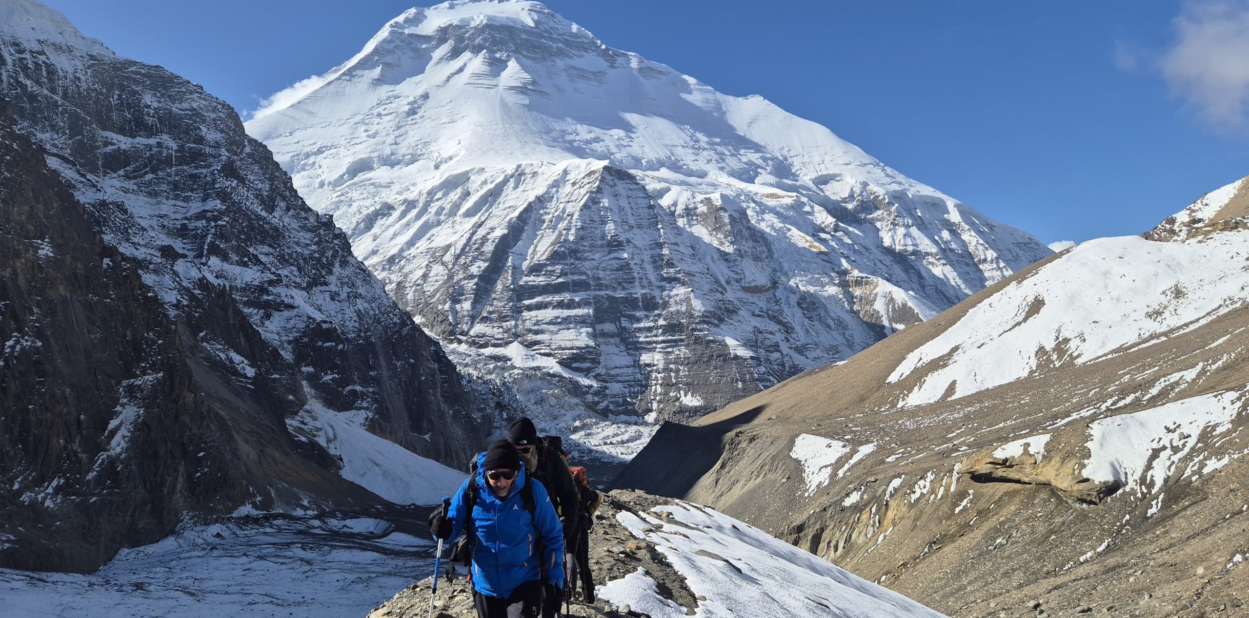 We will trek from Italian Base Camp to Japanese Base Camp, navigating through the challenging terrain of Dhaulagiri North Glacier Canyon. The trek involves traversing rocky paths and steep ridges.