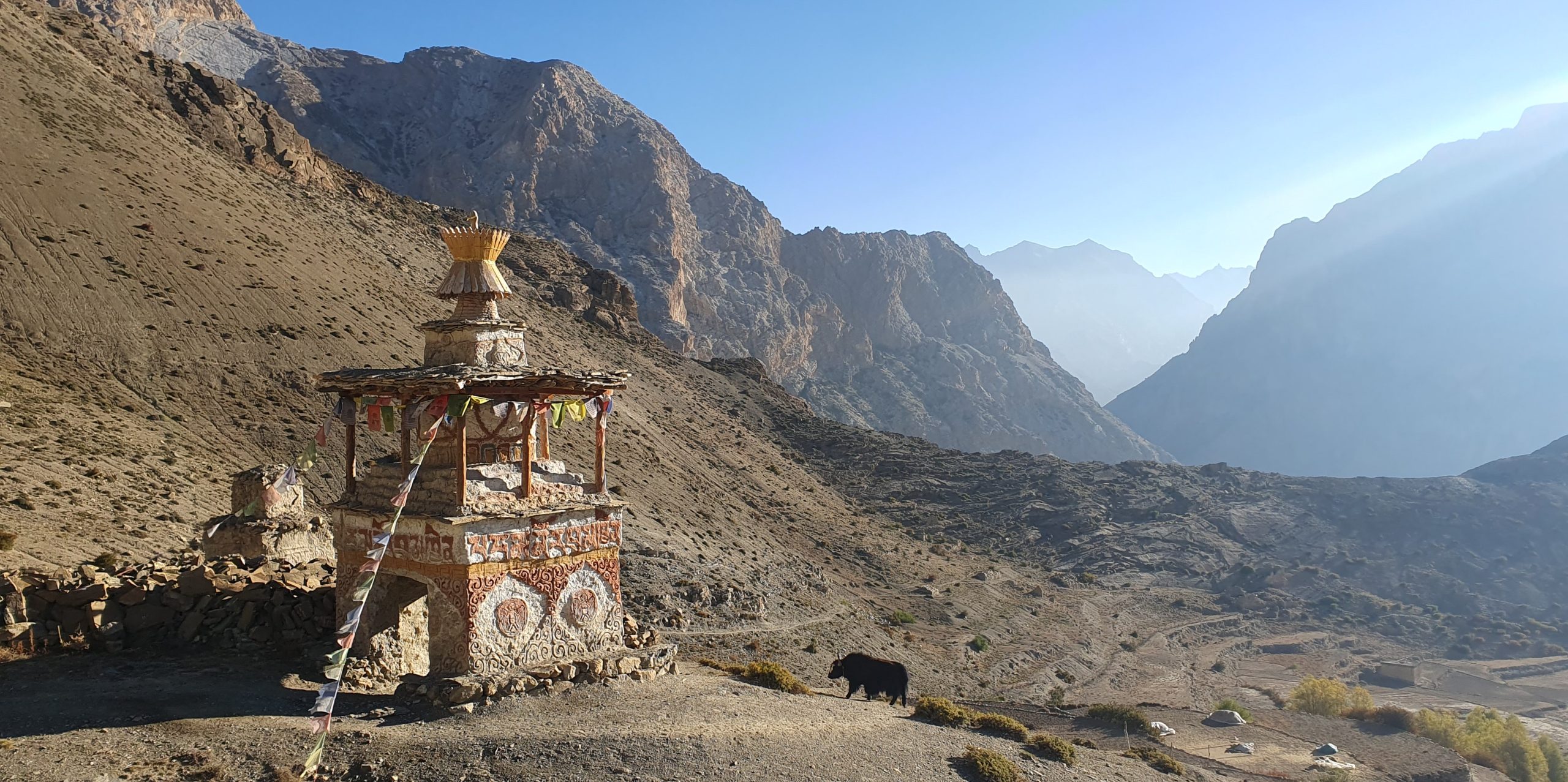 We will trek alongside the Kanju River, passing by Shey Monastery and its red houses. Along the way, we’ll walk through meadows where yaks, sheep, and mountain goats (Chyangra) graze. To the west, we’ll see the majestic Crystal Mountain. This 6-hour trek will involve descending 660 meters.