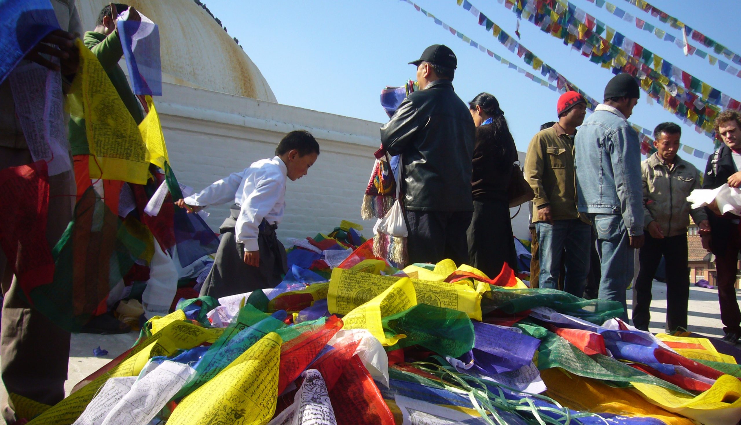 Descente sur Bodhnath. La petite ville est construite autour du plus grand stupa de la vallée. Les bouddhistes de tout le pays s’y retrouvent et tournent le soir en récitant des mantras. Sherpas, tamang, tibétains éxilés, bothias habillés souvent de la chuba traditionnelle forment une foule souriante et apaisante avec tous comme lien commun d’être originaire du Tibet.